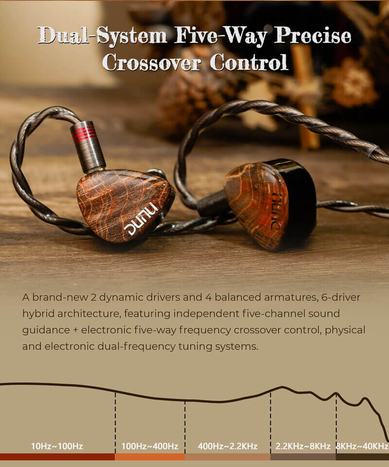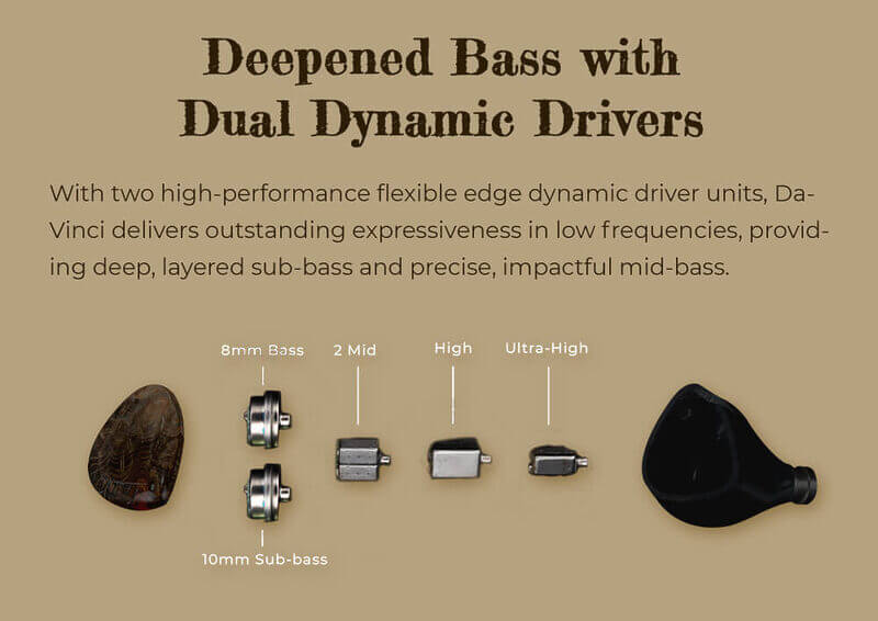 ドライバー構成は以下のとおり、2基のダイナミックドライバー(DD)と4基のバランスド・アーマチュア(BA)が搭載されており、ダイナミックドライバーは径が異なれど役割は「超低音域」向けとなります。