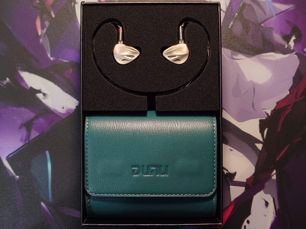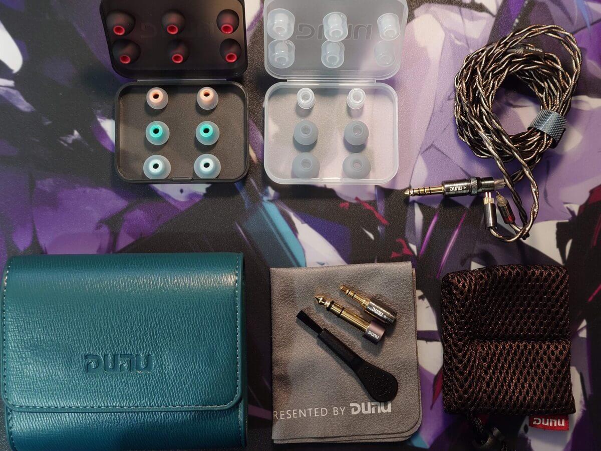 箱を開けると、上段にイヤホン本体が左右並んで固定され、その下にはDUNUロゴ入りの専用キャリングケースが配置されています。