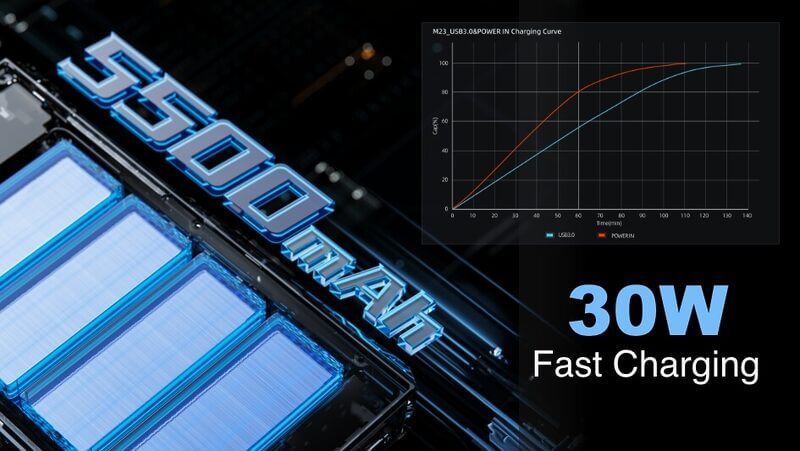 バッテリーは「5,500mAh」の大容量かつ、最大30Wの急速充電に対応しています。
