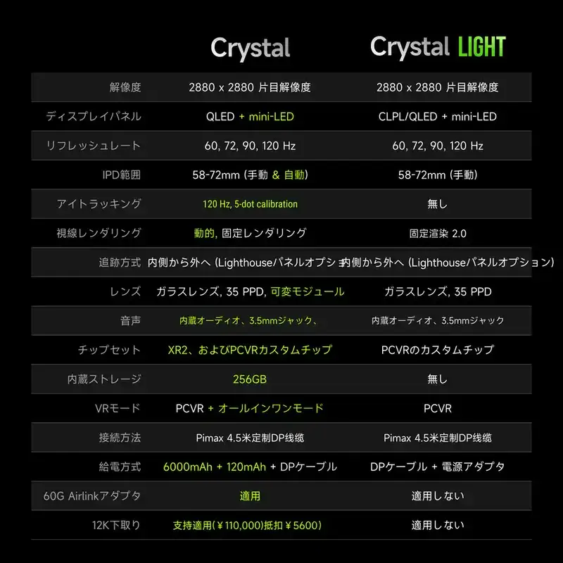 「Pimax Crystal / Pimax Crystal Light」の比較は以下のとおりです。