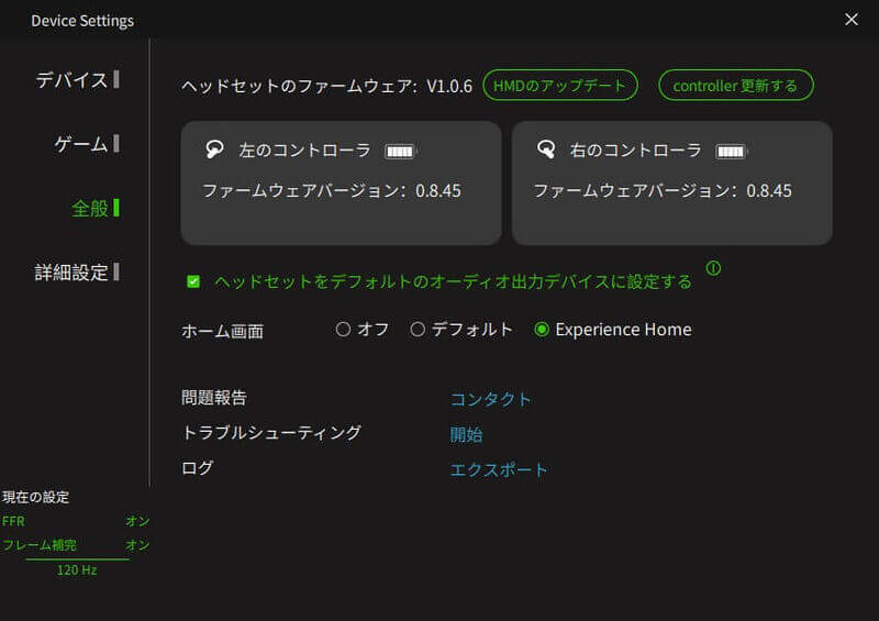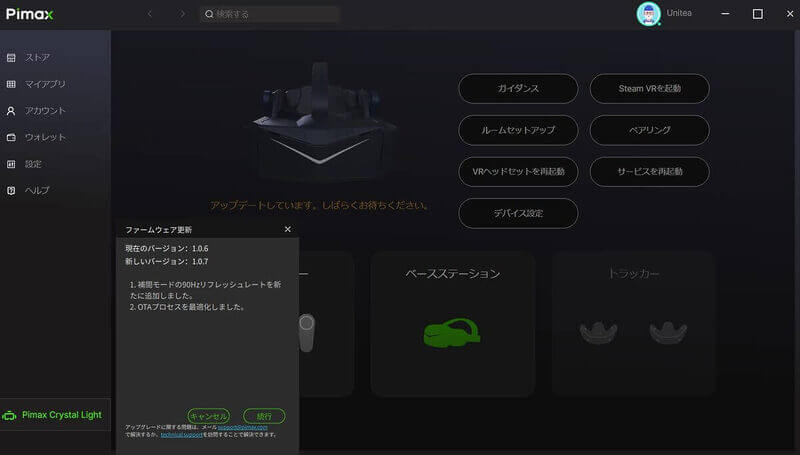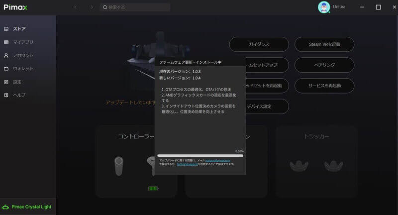 「Pimax Crystal」ではコントローラーのアップデートも通知されていましたが、今回の「Pimax Crystal Light」において、レビューにあたりお借りした個体では本体ファームウェアのアップデートのみとなっています。