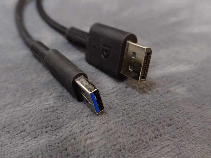 あとはPCへ「USB / Displayport」をそれぞれ接続し、ACアダプタを壁コンセントや電源タップへ繋ぐだけで準備完了です。