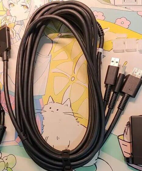 以下は「Pimax Crystal」の接続ケーブルと電源アダプタ・プラグ類ですが、いわゆる「全部入り」のような形で日本向けとしては煩雑さを感じていましたので、VR初心者の方もサッと使い始められるのは良い改善です。