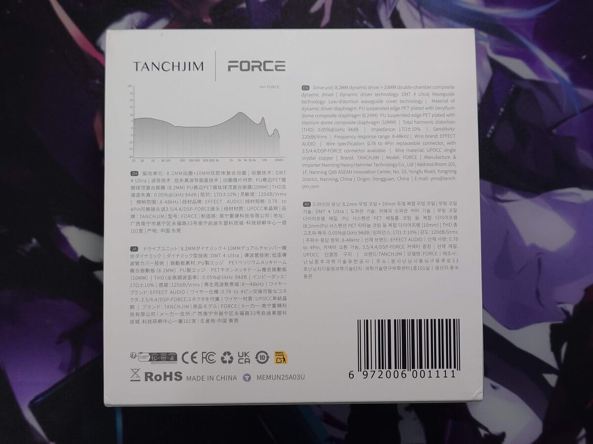 背面には、製品の詳細スペックが日・英・中・韓の4言語で記載され、周波数特性グラフも掲載。