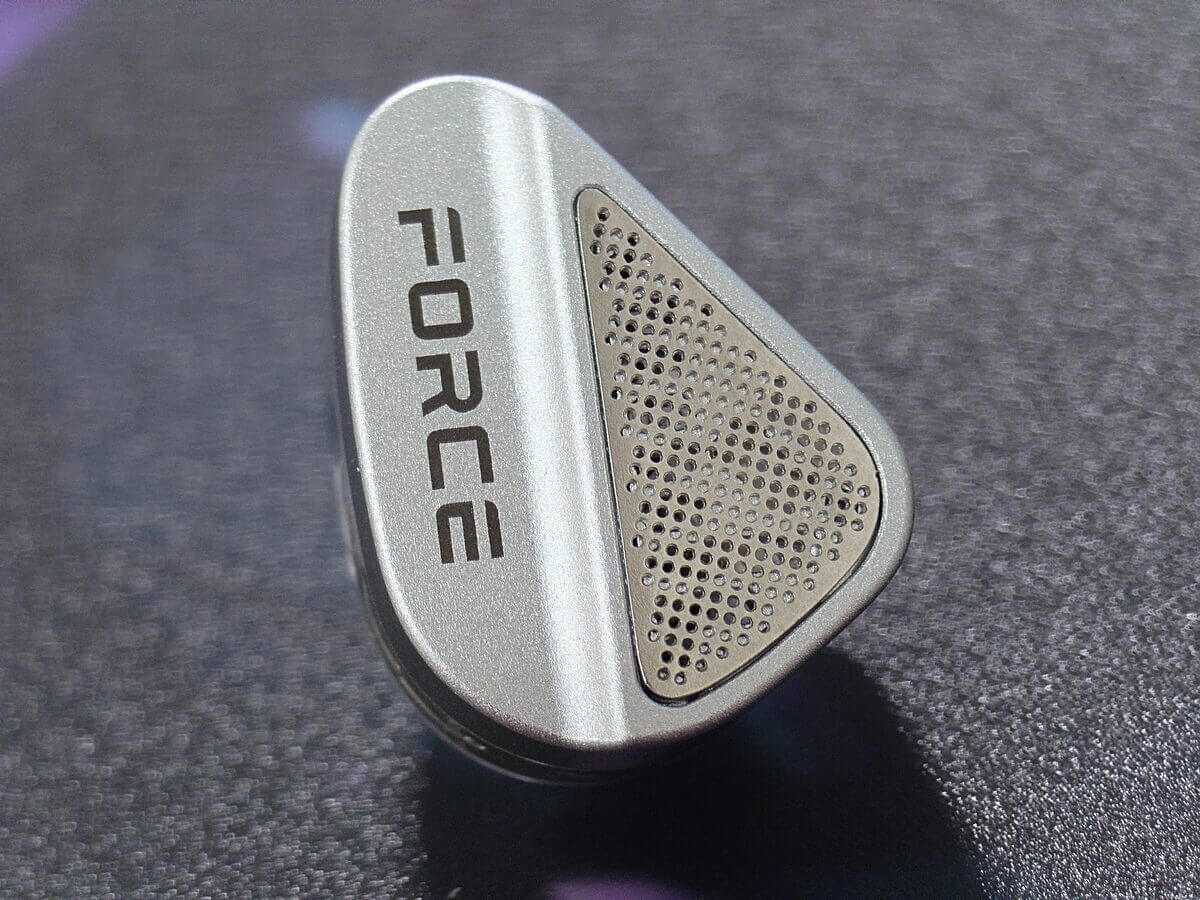フェイスプレートには、アルミ合金をCNC加工で精密に成形したパーツが採用されており、片側には「TANCHJIM」、もう片側には「FORCE」のロゴが刻印されています。