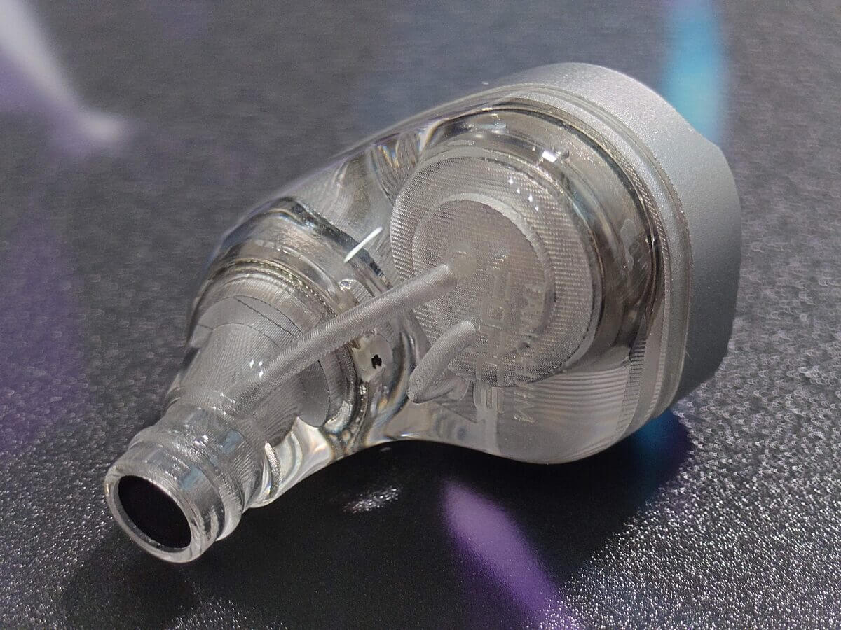 シェルには透明な医療グレード樹脂を用い、フェイスプレートにはアルミ合金をCNC加工で仕上げた高精度パーツを採用。