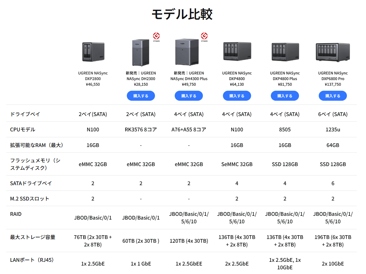 以下では、各モデルのセール価格を「NAS単体販売(Amazon / 公式ストア) / バンドルセット(公式ストア限定)」の順にまとめていますので、価格をパッと比較しておきたい場合にご参考いただければ幸いです。